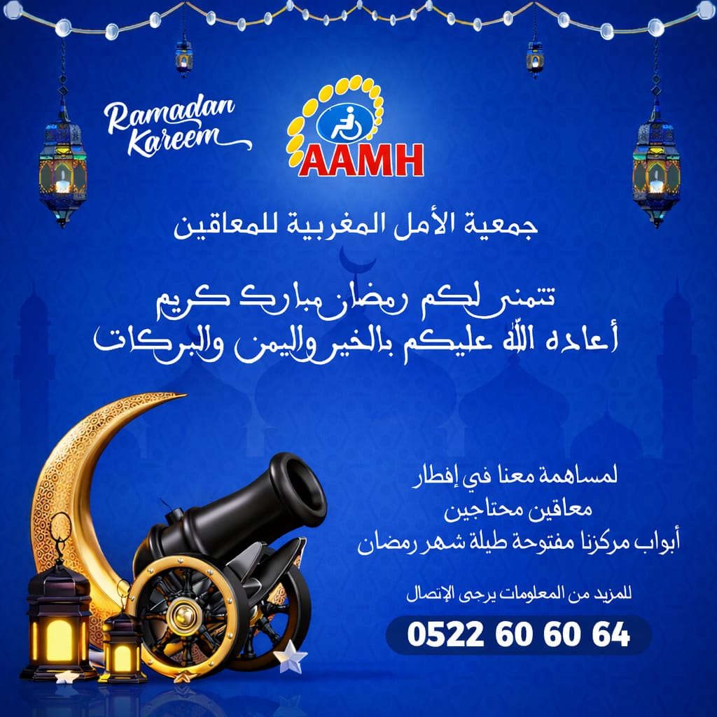 L’Association Amal Marocaine des Handicapes AAMH est une ONG national à but non lucratif à caractére social.éducatif .culturel et sportif.Crée en 1992 à l’initiative d’un groupe de jeunes handicapés de casablanca qui compte actuellement plus 4500 handicapés.