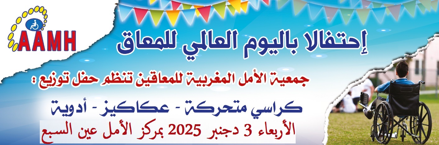 L’Association Amal Marocaine des Handicapes AAMH est une ONG national à but non lucratif à caractére social.éducatif .culturel et sportif.Crée en 1992 à l’initiative d’un groupe de jeunes handicapés de casablanca qui compte actuellement plus 4500 handicapés.